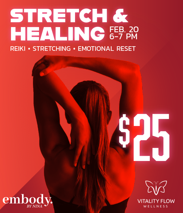 Slow down, breathe deeply, and reconnect with yourself through gratitude. Join Tiffany Vitale for Stretch & Heal—a restorative class blending gentle yoga, mindful movement, and Reiki healing energy.